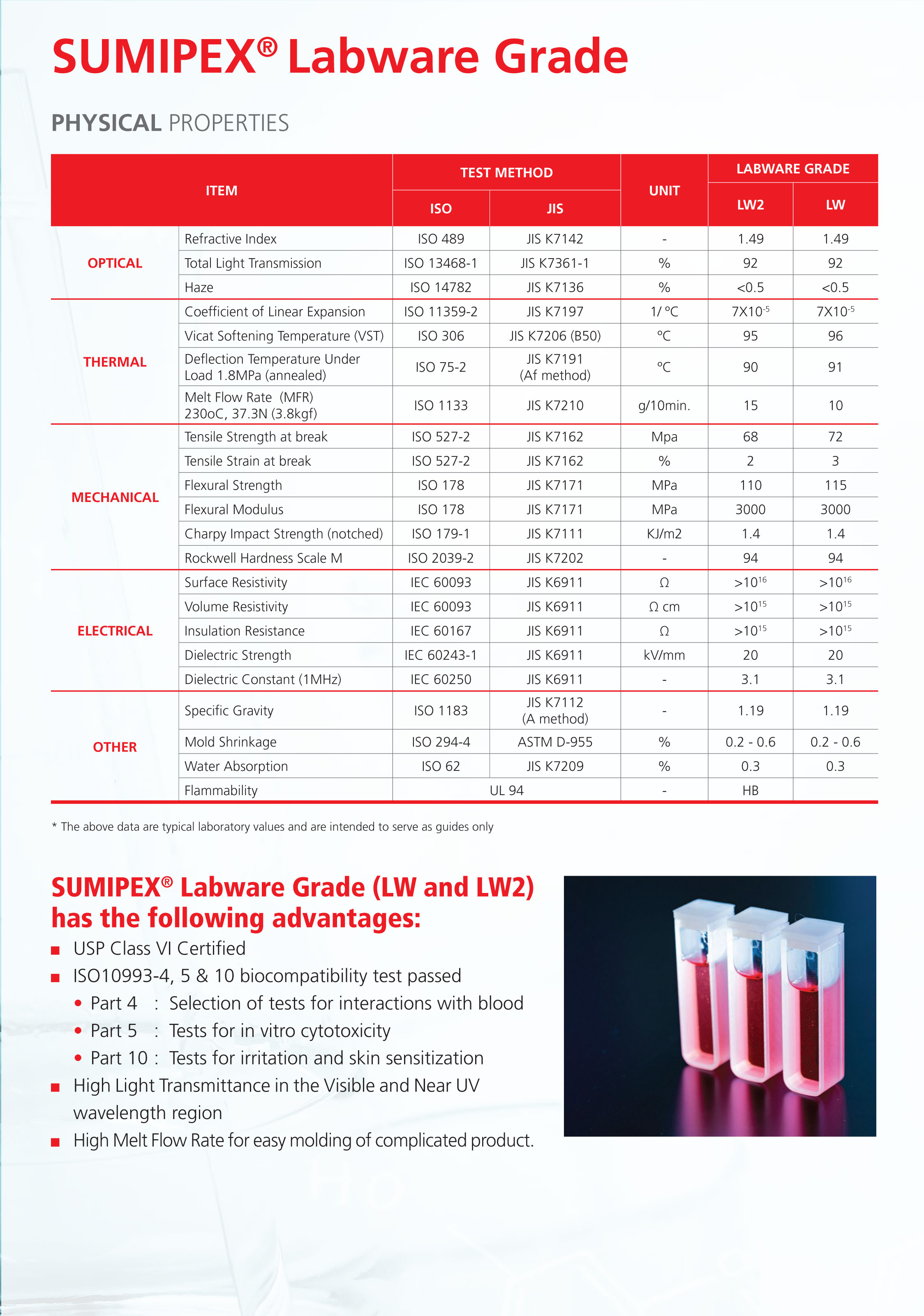 SUMIPEX® is renowned for its excellent clarity, weather resistance and superb optical properties, and is used for a wide range of applications as a high-quality resin for products that include automobile parts, LCD displays (for desktop laptop monitors), extrusion sheets, optical lenses and tableware. In recent years we have further enhanced SUMIPEX® in response to market needs by adding extra features such as greater impact, plus heat and chemical resistance to create a totally unique product line-up.